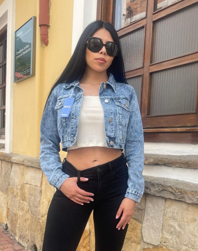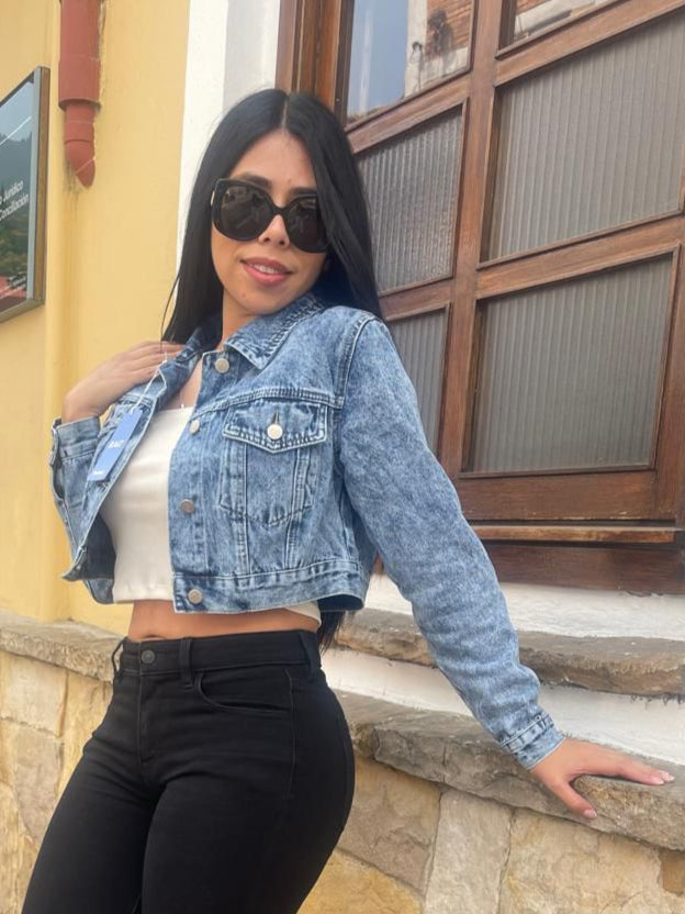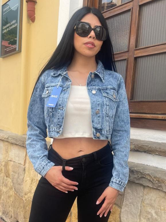 Chaqueta de cuello solapa y manga larga acabada en puño con hombro caído. Bolsillos de plastrón en pecho. Bajo con trabillas. Cierre frontal con botones metálicos.